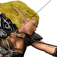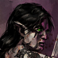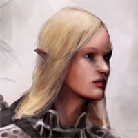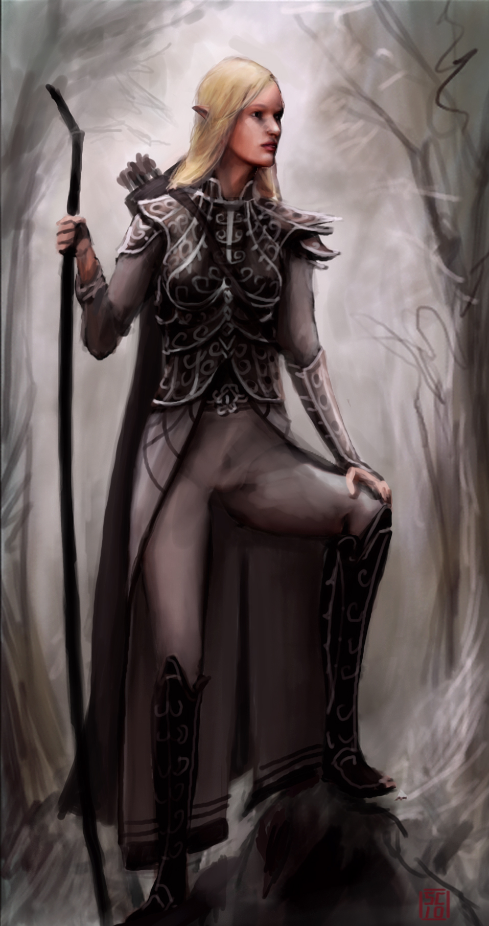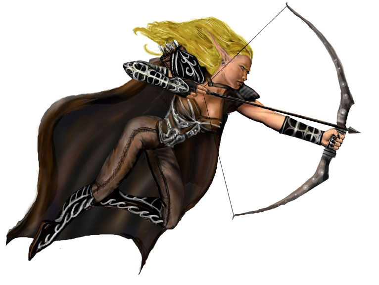 This image by Stephen Cousins artistically portrays the beauteous Sera Poi, girded for battle and scanning the misty forests for any sign of her enemies.